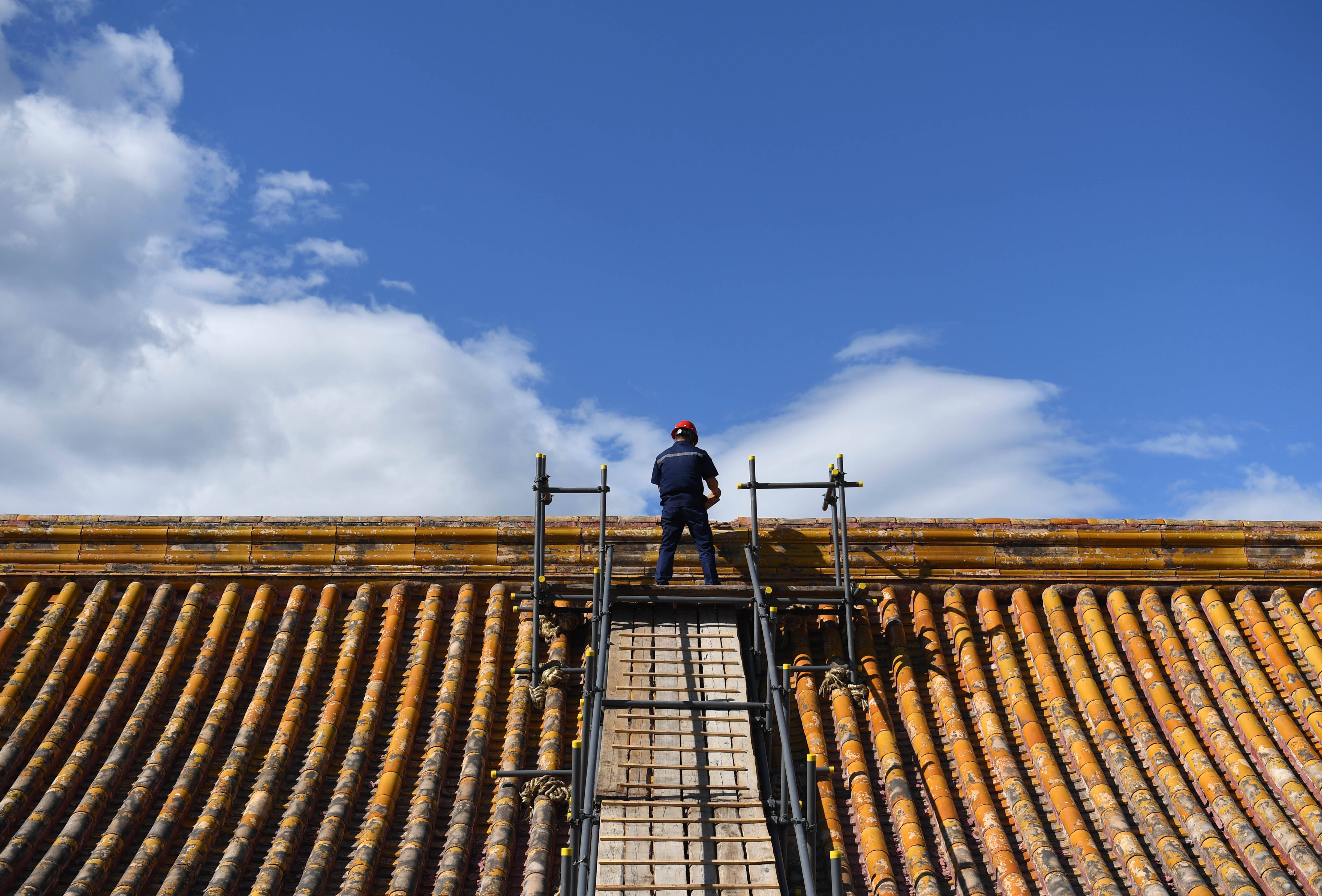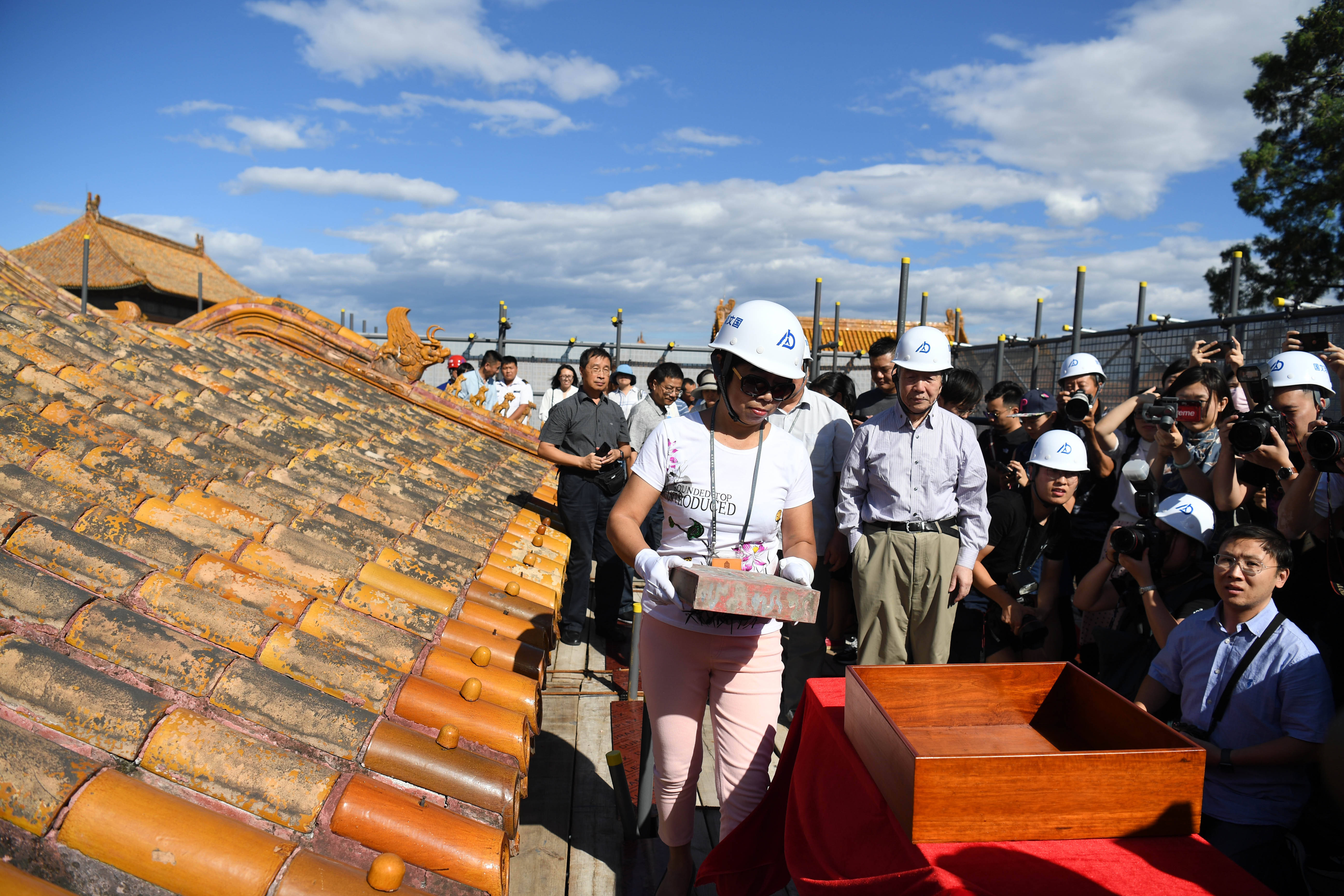 2018年9月3日,工作人员取出养心殿正脊内的宝匣后将瓦片放回原处。